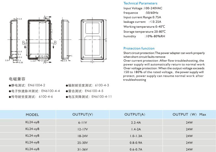 過流保護(hù):過流故障排除后,電源將自動(dòng)恢復(fù)正常工作 過壓保護(hù):當(dāng)輸出電壓超過額定電壓的150~180%時(shí),電源將保護(hù),故障排除后電源能恢復(fù)正常工作 輸入電壓:100-240VAC 頻率:50/60Hz 輸入電流:0.75A 漏電電流:<0.25A 工作溫度:0-40℃ 貯藏溫度:-20-80℃ 濕度:10%-80%RH" />